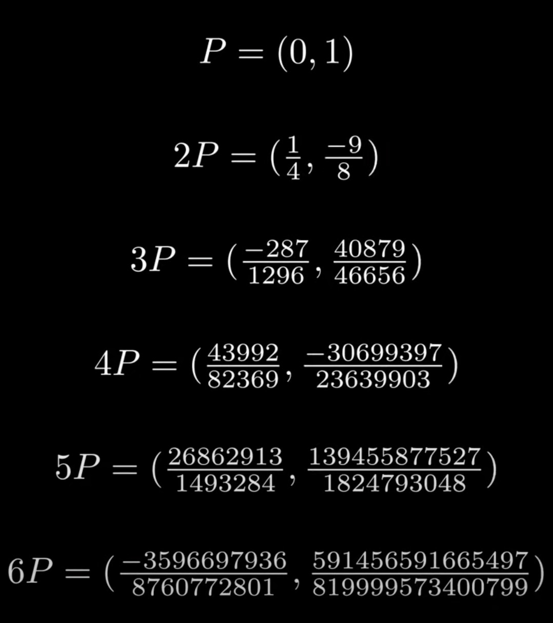 The consecutive points of curve with the beginning point are as follows. For just few steps, the numerator or denominator are going to be too large for computers
